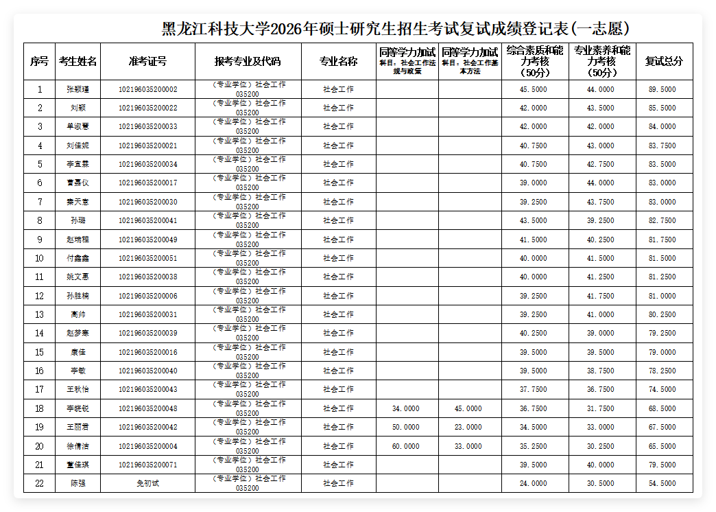 黑龙江科技大学2026年硕士研究生招生考试复试成绩登记表(一志愿)